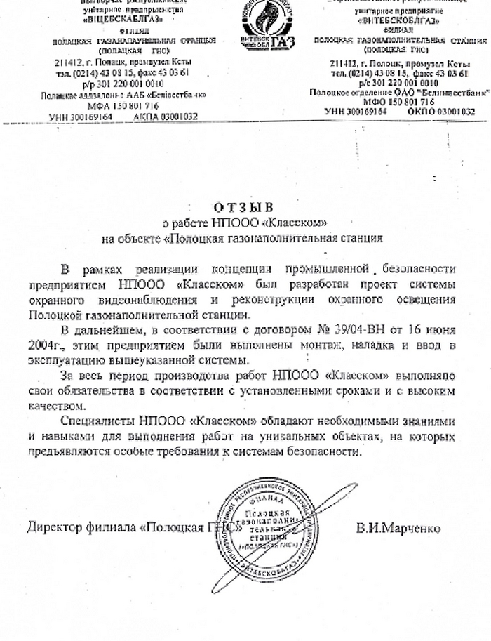 Все объекты смонтированы качественно и сданы в срок в эксплуата¬цию районному отделу «Охрана». Как показало сотрудничество в данной области с компанией НПООО «Класском», предприятие обладает большим научно- техническим потенциалом, имеет в штате большой набор специалистов профессионалов и может смонтировать систему безопасности любой сложности.