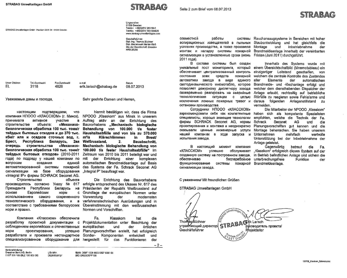 Сотрудники НПООО «КЛАССКОМ» зарекомендовали себя как компетентные специалисты, хорошо знающие технологии фирмы SCHRACK Seconet AG, нормы проектирования и монтажа и неоднократно оказывали ценные инженерные услуги нашей компании в ходе запуска и испытания завода.