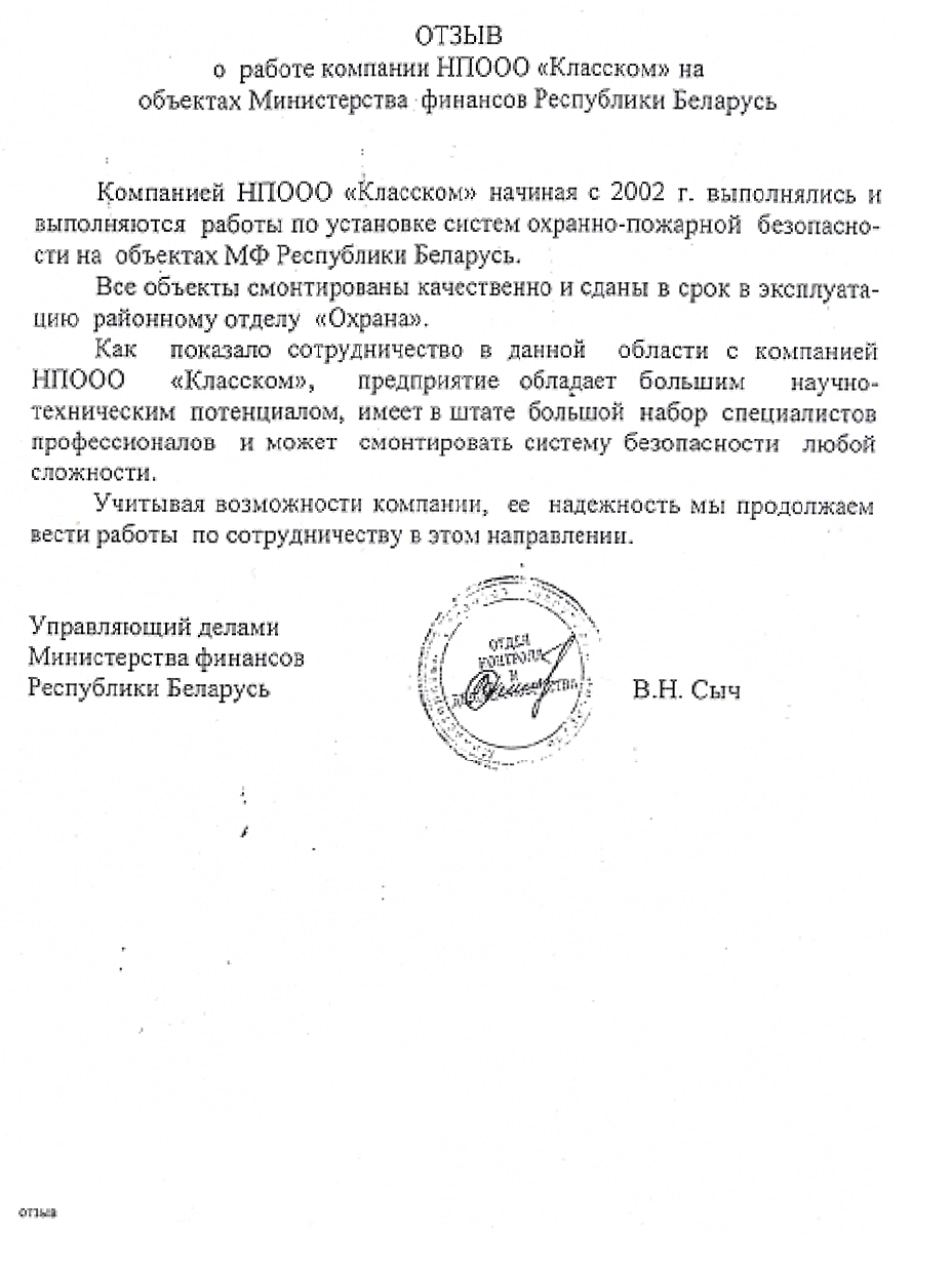 Компанией НПООО «Класском» начиная с 2002 г. выполнялись и выполняются работы по установке систем охранно-пожарной безопасно¬сти на объектах МФ Республики Беларусь.